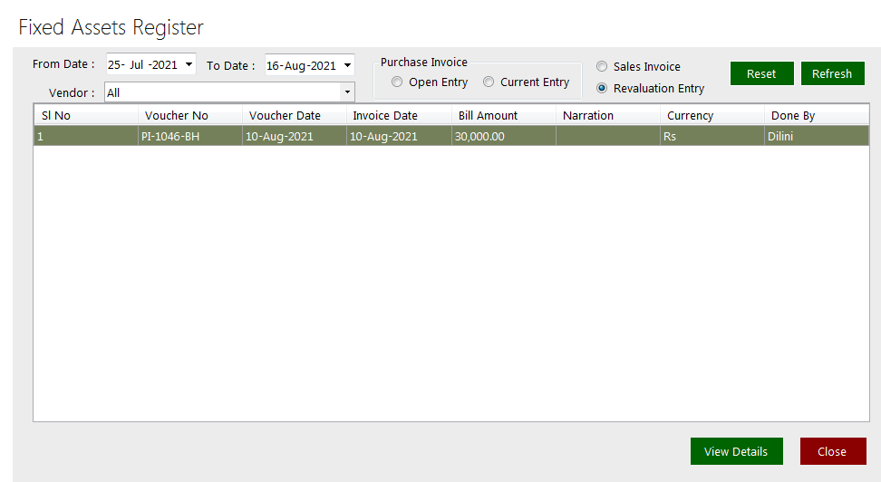 Location: Fixed Asset >> Reports >> Revaluation Loss/ Gain